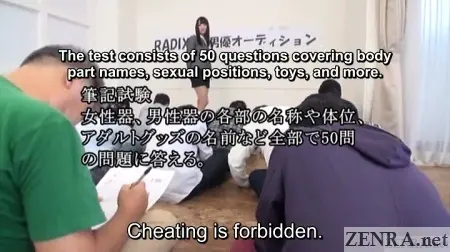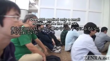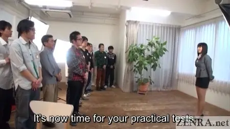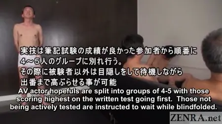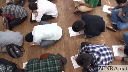 There are 15 or 20 men, ranging in age from 22 through early fifties. Not meaning to disparage, but most look like nerdy guys who spend all their free time in a dark room diddling their dicks while endlessly watching JAV DVDs. At first glance, none look remotely like the male actors I usually see in JAV productions. Anyway, the leaders hand out a written test to be completed. They warn it is very difficult, even for people in the business! The men are sitting on the floor and have to complete the test without any desks or tables of any sort, not the most hospitable approach.