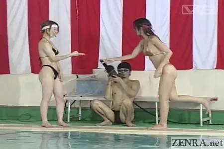 With financial melancholy out of the way, we present to you V&R's 36 WOMEN STRING BIKINI PERVERTED SWIM MEET! This is pure no holds barred big business #ClassicJAV. It was filmed at the Hayakawa Swimming Center (as is clearly noted in the credits thus is safe to say), a potentially defunct community swimming pool. The theme is less JAV title and more softcore series of games that at times will feature some accidental nudity. After all, all contestants wear tiny string bikinis and with all that moving around, sometimes certain body parts may pop out.