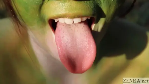 From start to end, she managed to not only keep her tongue hanging out, but did a pretty sound job in emulating frogs. We wonder if she spent some pre-production time out in nature watching the real thing. If she lives in the Japanese countryside, this may be easier than you'd think given the extreme abundance of frogs around rice paddies.