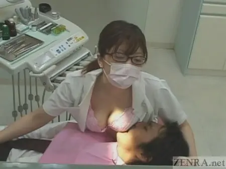 Insatiable this client is, he begins feeling her curvy body through her uniform and after telling her that they won't get caught, he amazingly convinces this cute Japanese dentist to strip totally naked and continue cleaning his teeth in her birthday suit! While she is trying to concentrate on working while totally in the nude in a public place, our client's cock returns to its throbbing status as the feeling of soft, large breasts brushing up against his mouth is just too much. He has the nurse pause again from cleaning to give him a thorough handjob down south leaving him totally satisfied and a repeat customer for life.