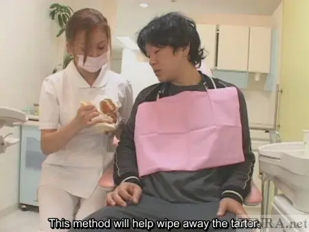 A cute Japanese dental hygienist with a very large rack is shown with a power toothbrush in hand performing a routine cleaning. Aside from the fact that she is wearing a very low cut uniform exposing more cleavage than what is usual for an office setting, nothing seems truly out of the ordinary—that is until her client's cock begins to cause a very noticeable mountain to form through his sweatpants. Trying to focus on the task at hand, our busty hygienist continues cleaning while taking intermittent glances at his pulsing, still-covered hardon, but soon enough he stealthily lowers his pants leaving his cock right out in the open! She asks him to pull his pants back up but he replies that the 'room is so hot and he needs some fresh air so it can't be helped' she tries her best to go back to work. Soon enough, her client begins jacking himself and when this isn't enough he asks the hygienist for some help down 'there'. She declines at first but soon enough, lust takes in and confirming that no one is around, she begins to give a nervous handjob.