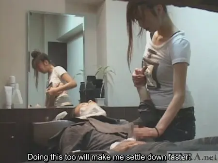 Next up, we are shown a Japanese hair salon staffed by what it seems like only girls with ample tits and male customers. Our client in question is having his hair washed by one of the outgoing young busty employees and while she is scrubbing in the treatment, he whips out his cock and starts jerking it off right there. Predictably, she's surprised at first and asks him to put it away but he casually declines and lets her know that since in Japan, the 'customer is god' (this is actually a true!), he should have all his needs assisted with. Noting that although the customer is indeed important, she informs him that there are some things she shouldn't do at work but while she is stammering and trying to find reasons to get out of this handjob, our client has already stealthily took her soft hands and moved them over his manhood and has had her unknowingly pump it for the last few moments. Noting that no one is around, she continues while her lucky client convinces her to remove her top to expose her magnificent round tits to which he fingers and gropes as she pleasures him till a satisfying conclusion—and as a bonus, this extra time allowed the treatment to really sink into his roots giving his a marvelous luster and giving her a huge, spunky tip in the process.