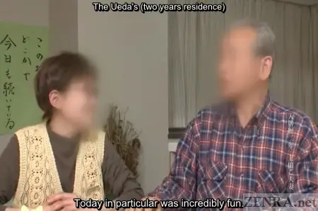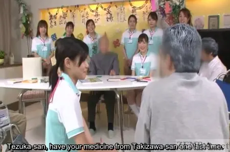 In one of the final scenes of this unique documentary on the lives of a group of very lucky seniors participating in a wacky new assisted living facility, we see one of the residents celebrating his birthday in the games room along with the rest of the residents and all of the cute bottomless Japanese caregivers. As the party begins to wind down after a good fifteen minutes of mild festivities, one of the exposed attendants with a milky soft ass and a somewhat unshaven bush (which is the style) asks him what his birthday wish is. Bashful at first mentioning that if he states his wish, people may think him strange and it most likely won't come true, she comforts him while patting his crotch and tells him that he shouldn't think so negatively and to spill the beans. Finally he confesses that he would like to make love to one of the caregivers—preferably her—right in front of everyone. Smiling, she removes his undergarments while he sits back slack-jawed with a dreamy gaze across his face while the room full of seniors and their half-naked female Japanese companions with large tits watch on in glee as they have sex all the way to its lustful conclusion.