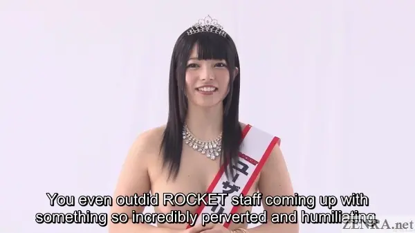 THE DISGRACED BRIDE bears a lot of similarities with the previously mentioned MIORI HARA announcer title. This time I think TEMPLE SUWA handled the pacing a lot better and the sex--both the obviously fake five minute raw affair after bingo and the *real* extended encounter at the end were fantastic additions. Pure embarrassment performances can only go so far and even I was growing a wee bit tired during the latter portions of lewd phrase bingo.