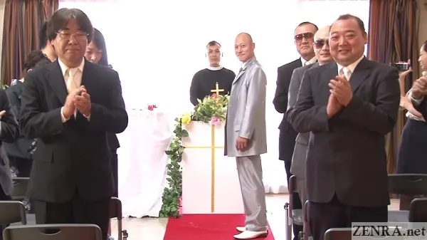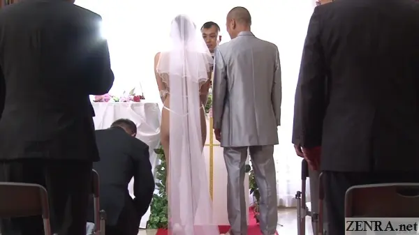 The wedding itself is Western traditional — complete with a “priest” with a huge toy cross hanging upon his chest (comical to me as I’ve done a lot of wedding photography). The bride is in a humiliation costume leaving her virtually naked — with bells dangling from her nipples. Apparel for the groom is standard crime group upscale. He promises to take care of her, she promises to obey him, her wedding ring is a bright red slave collar. And then it’s on to the wedding reception.
