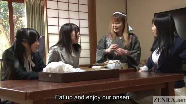 Rather than the three scenes we saw in the first one and the six or so (!) we got in its incredible sequel, we just get two each starring three actresses. Both pretty much follow impromptu mixed bathing leads to a naked dash through the lobby only to end up having sex while everyone watches format. The first scene has it all happening in the lobby and the second we see the trio of embarrassed bathers become 'pink companions' similar to how the final scene in ITAZURA ONSEN 2 ended.