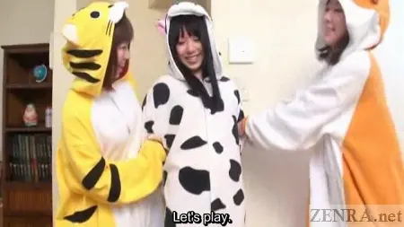 That's what today's production is about, really. Not normal cosplay per say, but pert Japanese AV stars living out the fantasies of those who enjoy their women dressed from head to toe as wildlife. There's the cow, the tiger, and something that resembles a hamster. All feature fluffy hoods that at times cover their faces and all work wonders at hiding their bodies.