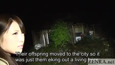 There are instances of erotic play here and there such as the remote control vibrator walk down a haunted tunnel. Then there's the masturbation scene in a car facing a house haunted by a mummified, neglected grandma followed by covert fellatio in the same vehicle. We also see YURI SATOU visit an off-the-ledger love hotel room that was home to a grisly act of one-way passion. There, with the director they investigate the presence of the supernatural by having sex because...why not?