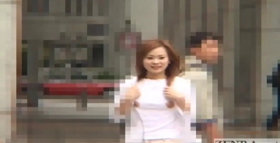 ABSOLUTELY STUPID NUDITY BEGINS even for a gung-ho outdoor exposure release is extra rough. This was shot well before the slightly slicker titles we've already shown on ZENRA and the tried-and-true format was still a work-in-progress. This title also featured brief amateur flashing in between the actual scenes. Here, an amateur Japanese woman not involved in the main production was quickly interviewed out in the street somewhere and asked to flash her private parts. We weren't too thrilled with these scenes compared to the regular ones, but were very surprised to see a very MYUU going by an alternate stage name appear in one of them.