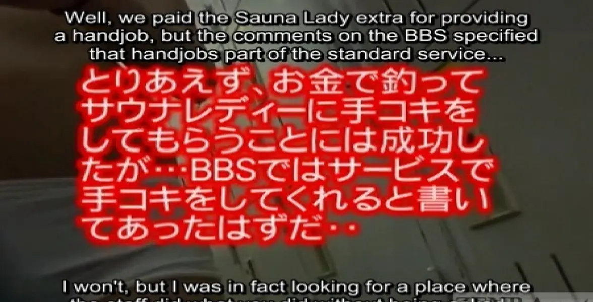 For such a well-reviewed bathhouse--or onsen as they are called in Japanese--finding it was a challenge. All this group of generally horny men knew was the area it was in. The reviewers were keeping its name hush-hush to avoid pressure from the authorities. After confirming with multiple hotels in town, they found a bathhouse that had Sauna Ladies on staff, but as shown in the first portion of the production, penis touching was on the menu, but it did not go all the way.