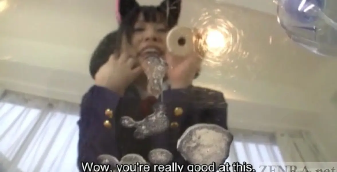 Costume changes happen somewhat often in FETIS titles. Yui Kyouno went through at least three and used a decent amount of toys. We even saw her with an anal-bead cat tail resting in a box while cradling a guitar in a rooftop fantasy scene featuring a confused yet elated nasal-enthusiast. He returns later in a very messy facesitting encounter that finishes with a pantyhose-clad footjob.