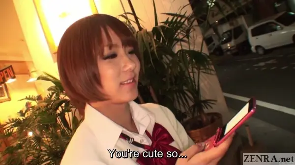 LATE NIGHT NANPA SUCCESS STORY stars AIKA SAEKI. We see her dressed in a high school uniform outside of a restaurant at night. She's idly playing around on her phone before Mr. Charisma*--the loquacious scruffy co-star of the Pubic Hair Shaving Salon enters the picture.