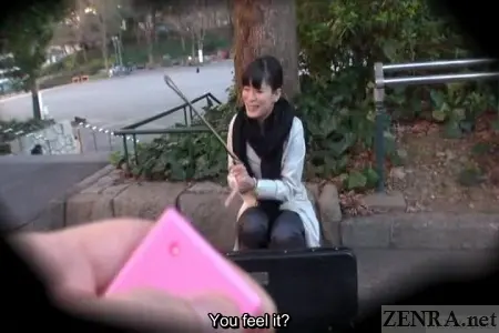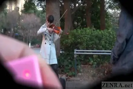 Emiri, the violinist, is about to experience a challenge like no other, but before her huge recital, the director takes her outside for a warm-up. In a park somewhere within Tokyo, she slides a remote control vibrator deep inside her and begins an impromptu performance of Air on the G String while a small, but dedicated crowd forms. Her violin's case is facing inwards hence the guilt of not giving a tip is certainly a plus. With avid appreciators of classical violin gathered around this kinda-sorta Japanese AV star, the fun with the vibrator begins...