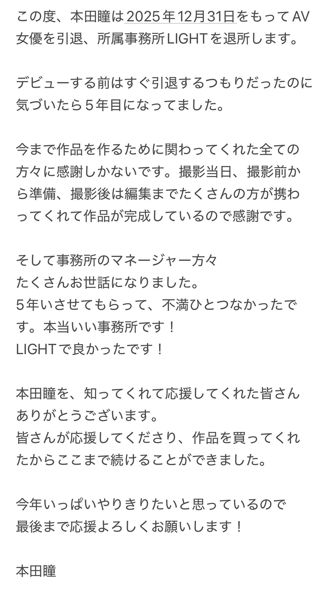 Earlier this month, Hitomi took to X to break the news in a discreet way, as she mentioned, stepping away from JAV while leaving her agency, LIGHT, on December 31, 2025. That’s right, come New Year’s Day, she’ll be closing the curtain on her brief career