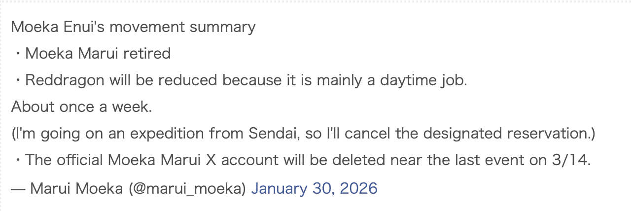 In the now-deleted statement, Moeka added a few details that only deepened the intrigue. She mentioned she’d be scaling back her work as a hostess at Reddragon, the premium hostess establishment where she’s been a regular. The reason? It’s primarily a daytime job, and she planned to work only about once a week. A curious phrasing, considering most retirees talk about stepping away, not reducing shifts. Moreover, she announced an “expedition” of sorts to Sendai and said that she would be canceling any designated reservations as a result.