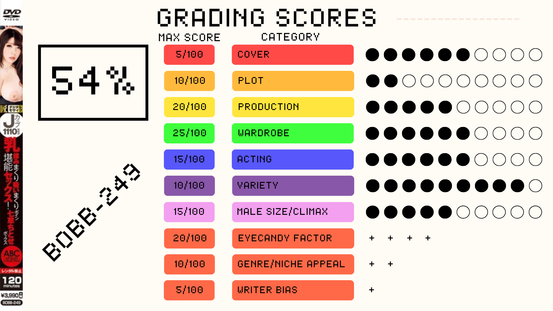 And that is all for my first movie reviews post! Interested to hear your thoughts and any recommendations for me to review in future posts since this will obviously be a series. I was honestly a bit surprised that even films that I've genuinely enjoyed and gone back to rewatch barely cracked 60% on my grading system, wonder if I should employ a couple heavy hitters (boob pun intended) next time around! Although it is understandable to be hard to get an amazing score since some of the categories work against each other. Can't have an amazing plotline without the wardrobe or variety suffering, as e.g an NTR film heavy on the plot won't really have crazy hot/flashy outfits and depend on lots of scenes with crazy positions. MV