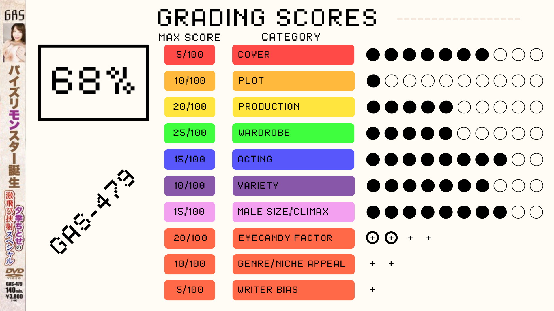 I'll be completely honest: I know this film very well and I expect it to get a good score. It's one I go back to time and time again, and for good reason. Not only are the films GAS makes usually right up my alley where big boobs are the A and Z, but this one is from their titty fuck series paired with one of the best titty fuckers in the business. Once again there's no plot unless "Chitose absolutely drains everyone she sees with her paizuri" counts as one. There's a total of 6 scenes with one being a full on sex scene and the others a mix of handjobs, blowjobs and -mostly- paizuri. The production is actually quite decent with every scene having a unique set (apart from the first and last scene that share one) and the camerawork and lighting being perfectly serviceable for the movie. After all the guys and gals at GAS know a thing or two about shooting paizuri.