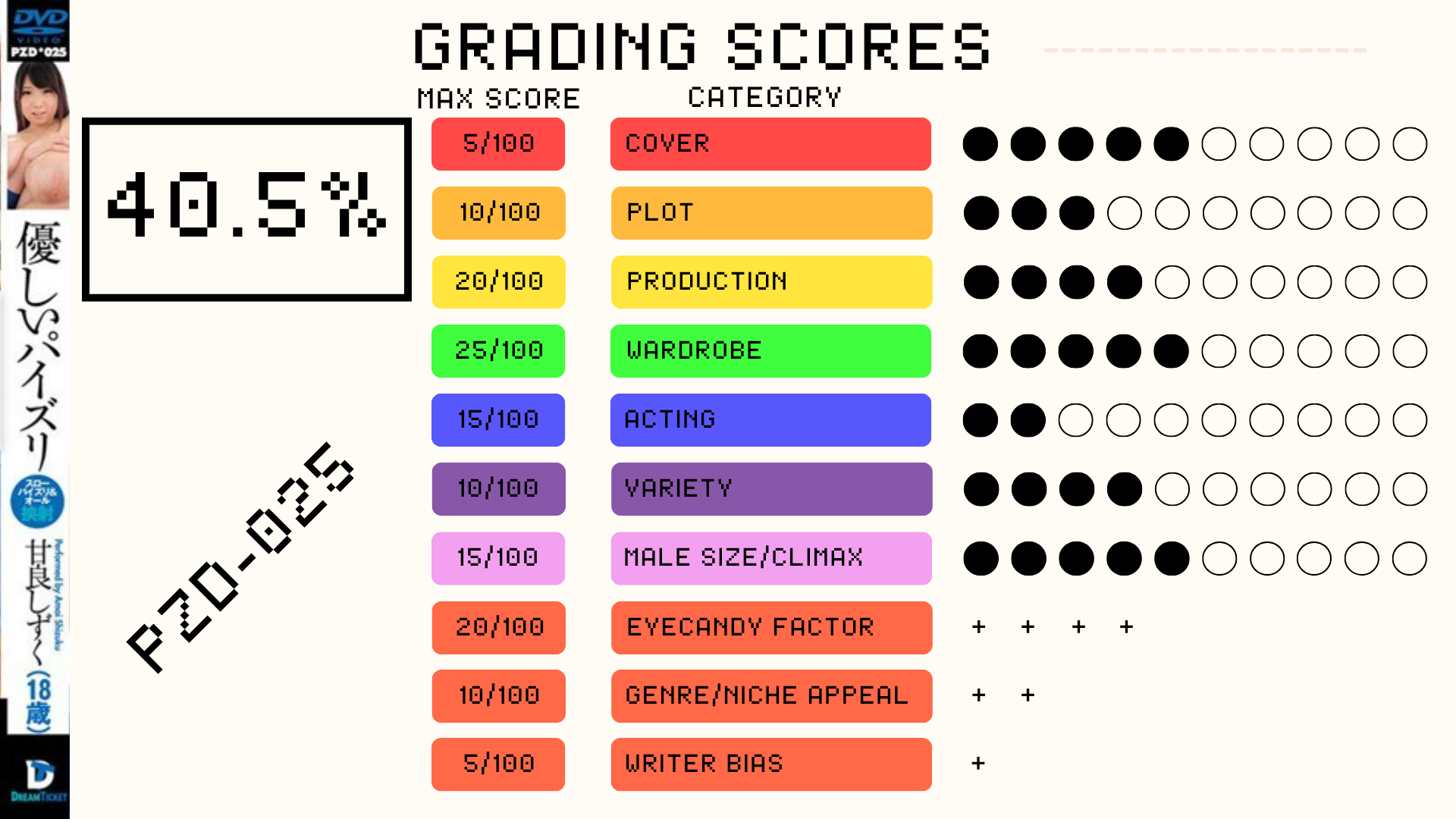 Despite my endless blabbering about that 1st scene, I will give the award of best scene to the 3rd one. As mentioned beforehand the interview was fun, and the cock hunting -while probably staged- was interesting to watch with Shizuku running from man to man with her huge melons moving around in her sweater and getting lots of sideways views from people. And the guys struggling to hold out without cumming, while a common trope in JAV it's always entertaining to watch and I don't blame them for struggling with these monsters around their dicks. Definitely a much better watch than PZD-025 and that's in part to Shizuku being slightly better in her acting which makes sense as it was a bit later in her unfortunately short career.