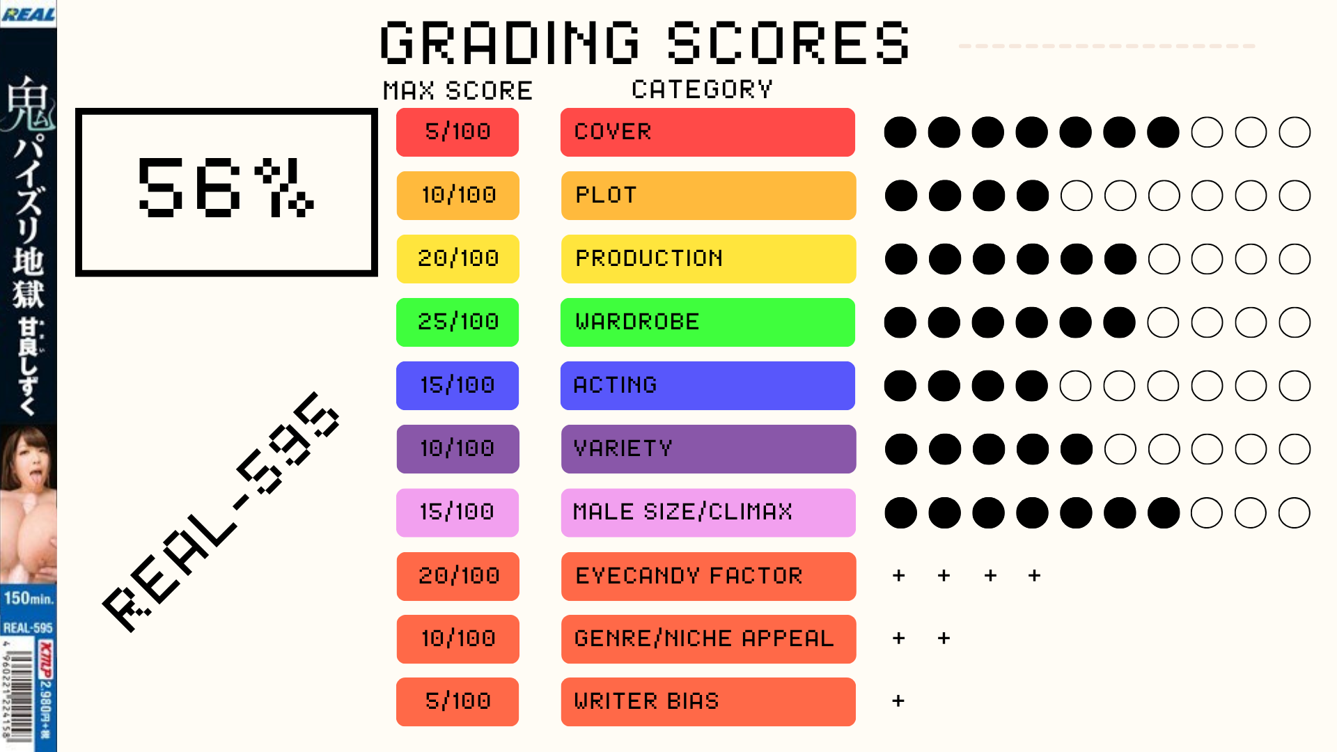 Let's see if Shizuku can turn it around because that 40% score above really stung for one of my actresses that I enjoy watching. REAL-595 is part of the "Demon Tit Fuck Hell" series that started all the way back in 2010 with Julia. Yes ok it's also about tit fucking, split into 5 scenes with the final one being a full sex scene. In my defense at least, the 3rd scene breaks up the pace by not only including an interview but having Shizuku go out into and try to pick up strangers to titfuck her with the prospect of if they can last 10 minutes, they can either creampie her or get 100.000 yen. As far as production goes it's above average as each scene has its own set -with decent lighting- and there's also the setting in the 3rd scene where she jumps in and out of a minivan to hunt down cocks. For a very simplistic premise it tries something extra and I commend it for that.