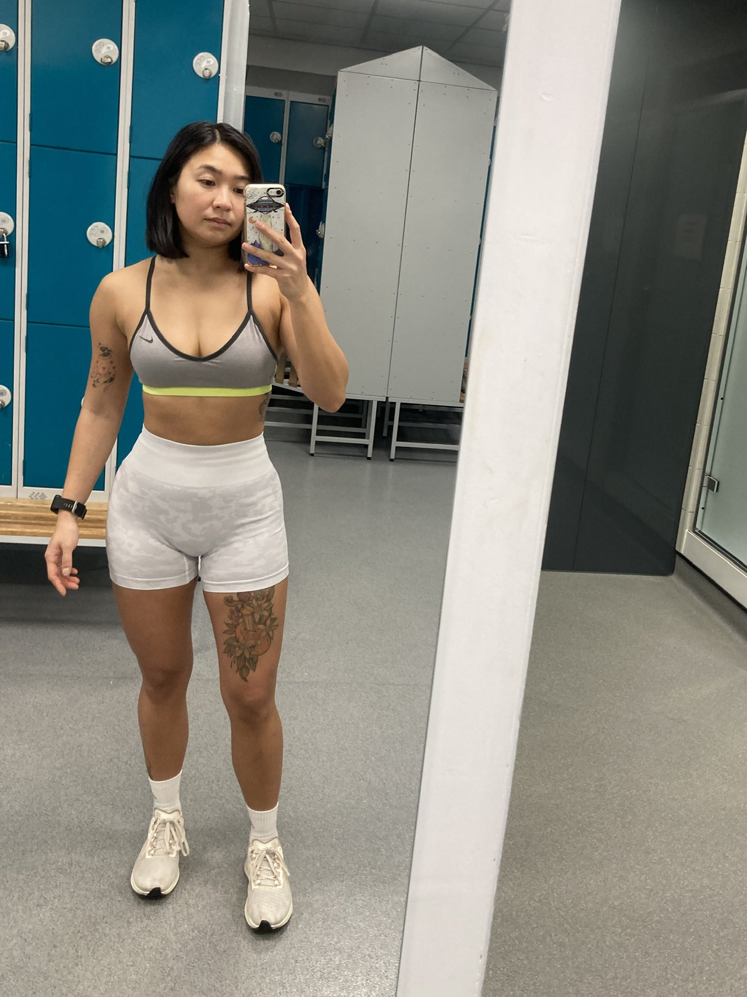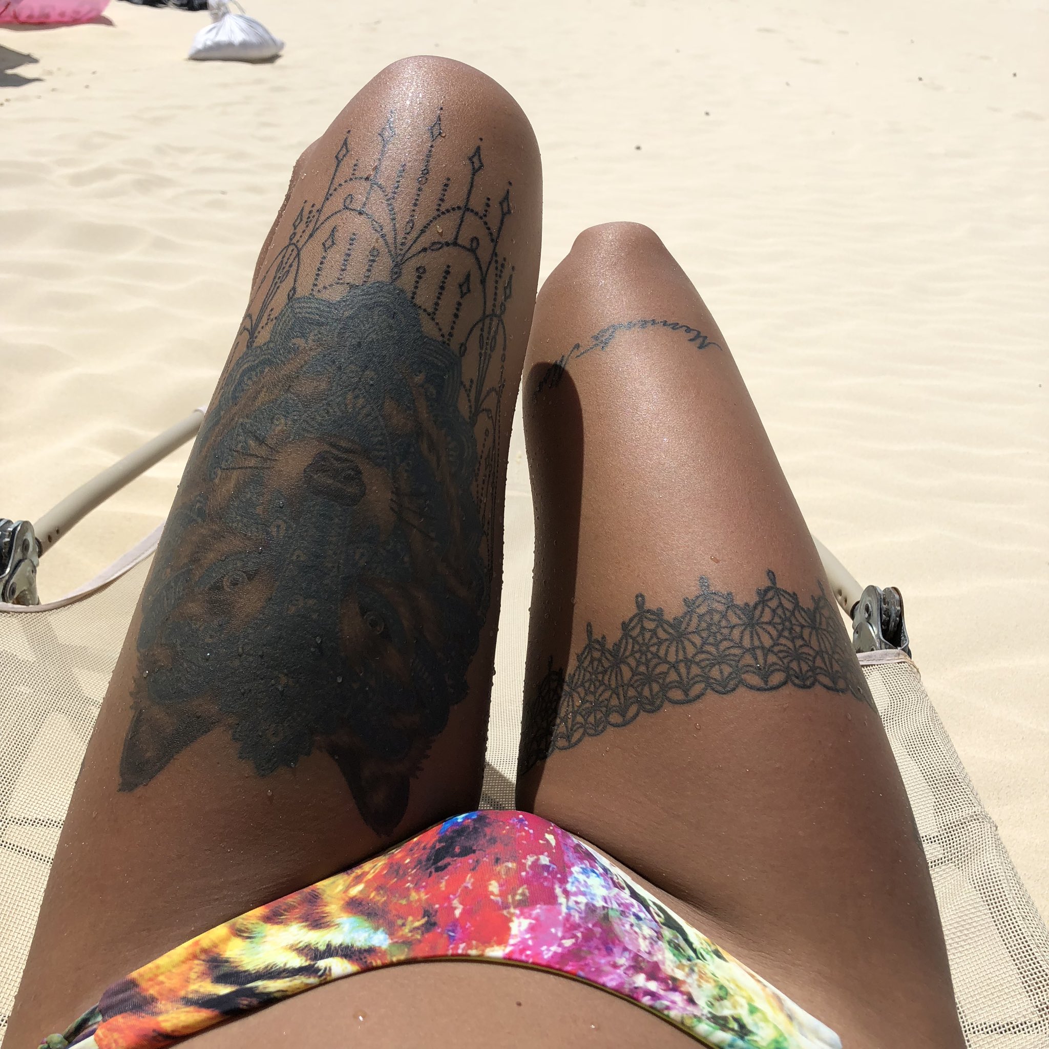 Now, this one, I am unsure of if she had them during her career. We are onto Nana Ogura of the 2010s, who was a star with MAX-A for a few years. Nana was much loved for her casual and loose attitude and her usually tanned figure. Some old fans of her noticed the same skin discoloration you see in tattoo cover up but it’s hard to say. Her tan also might have helped to cover it up, and she could’ve gotten them afterward. Nana has been retired for ages now and has quietly stayed in the eye with her socials. Now we can see her with some big tats and looking more beefed up from the gym. Her tattoos are of a dog with hearts on her arm and a flowery design on her front thigh.