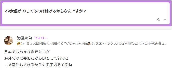 Example of how the account operates, anonymous user is asking if JAV actresses are DJing for income. Minatokukyoudai replies that there is demand for DJs overseas.