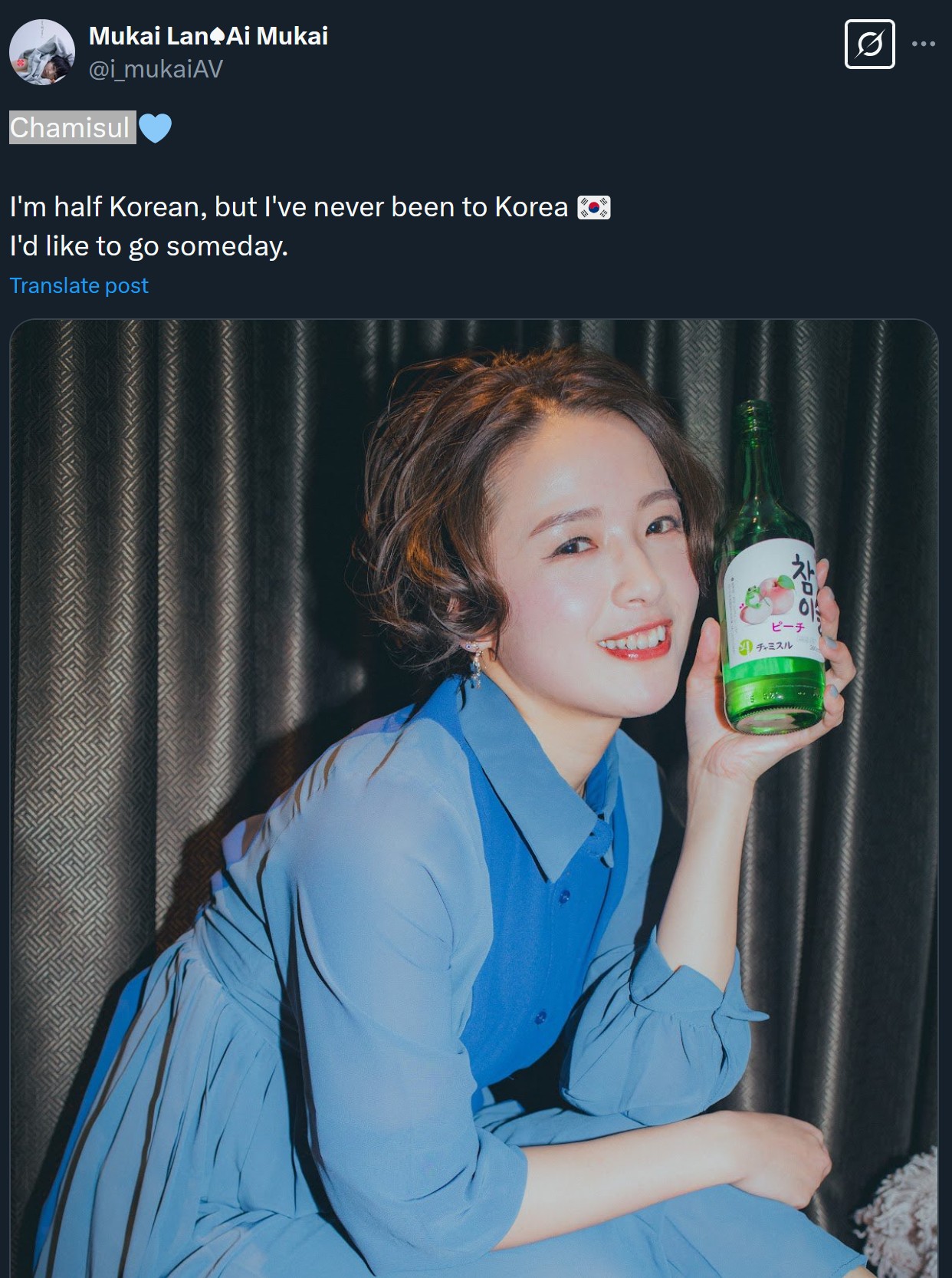Ai Mukai, the plucky veteran actress who has been around for over a decade, revealed rather off-handedly that she was half Korean. In a series of photos on her social media, she revealed her background while posing with a bottle of Chamisul (참이슬), a well-known Korean brand for Soju. Despite their proximity to Japan, there haven’t been many Koreans in JAV as the number of Koreans or part-Koreans actresses is surprisingly low. In fact, with this revelation, Ai Mukai might be the best-known Korean in JAV I can think of. I’ve always thought she had a unique face compared to most, so her mixed-race reveal wasn’t a huge surprise.
