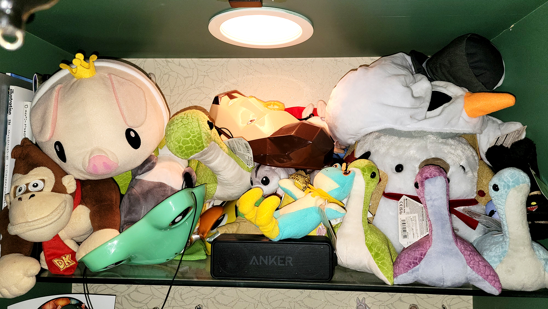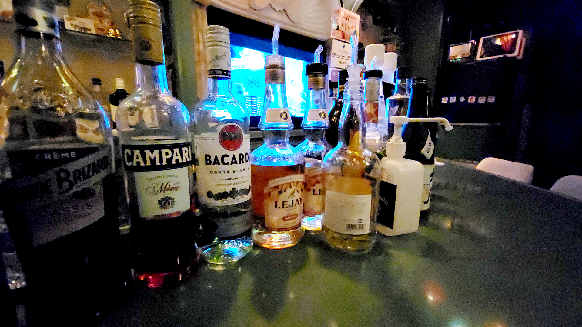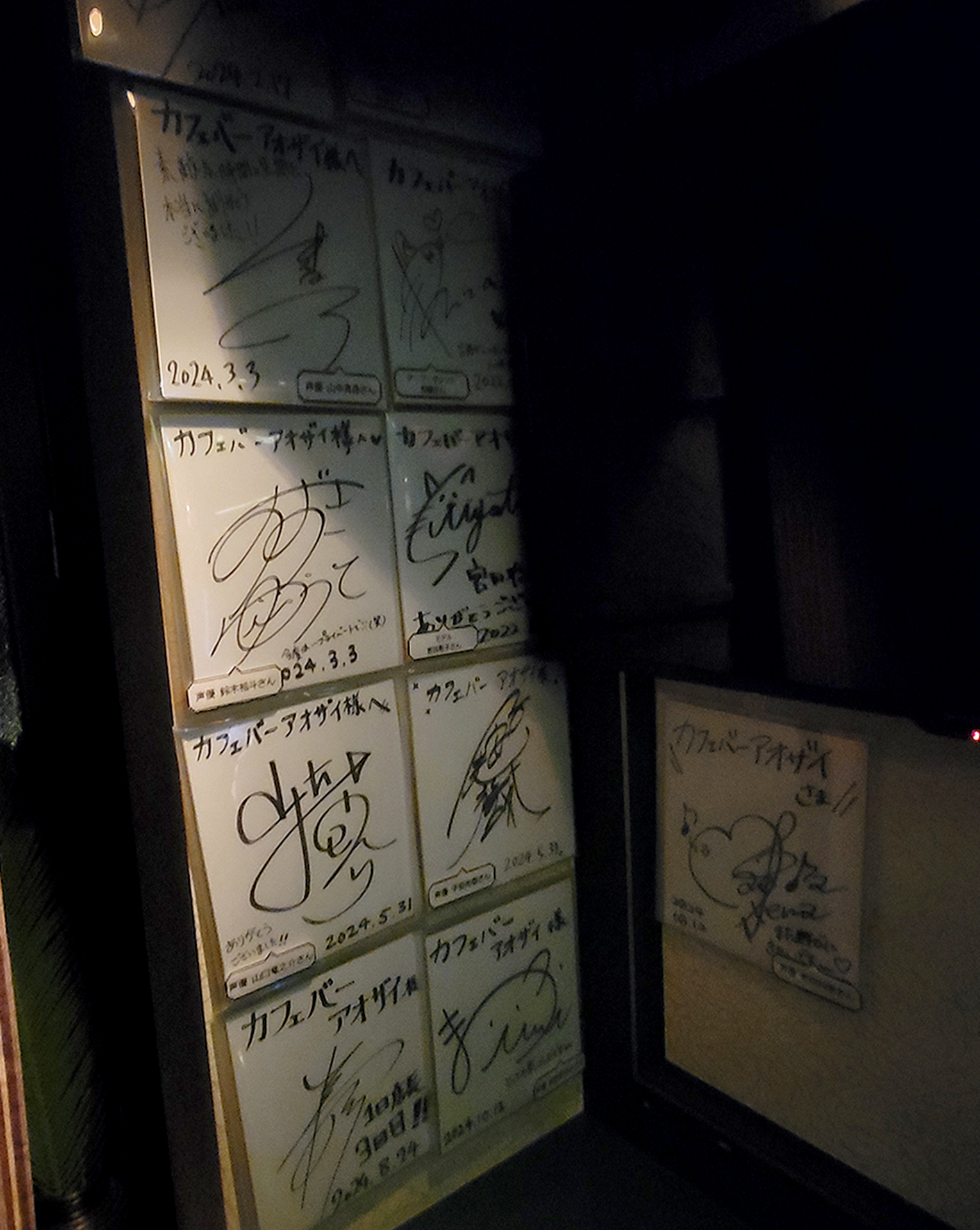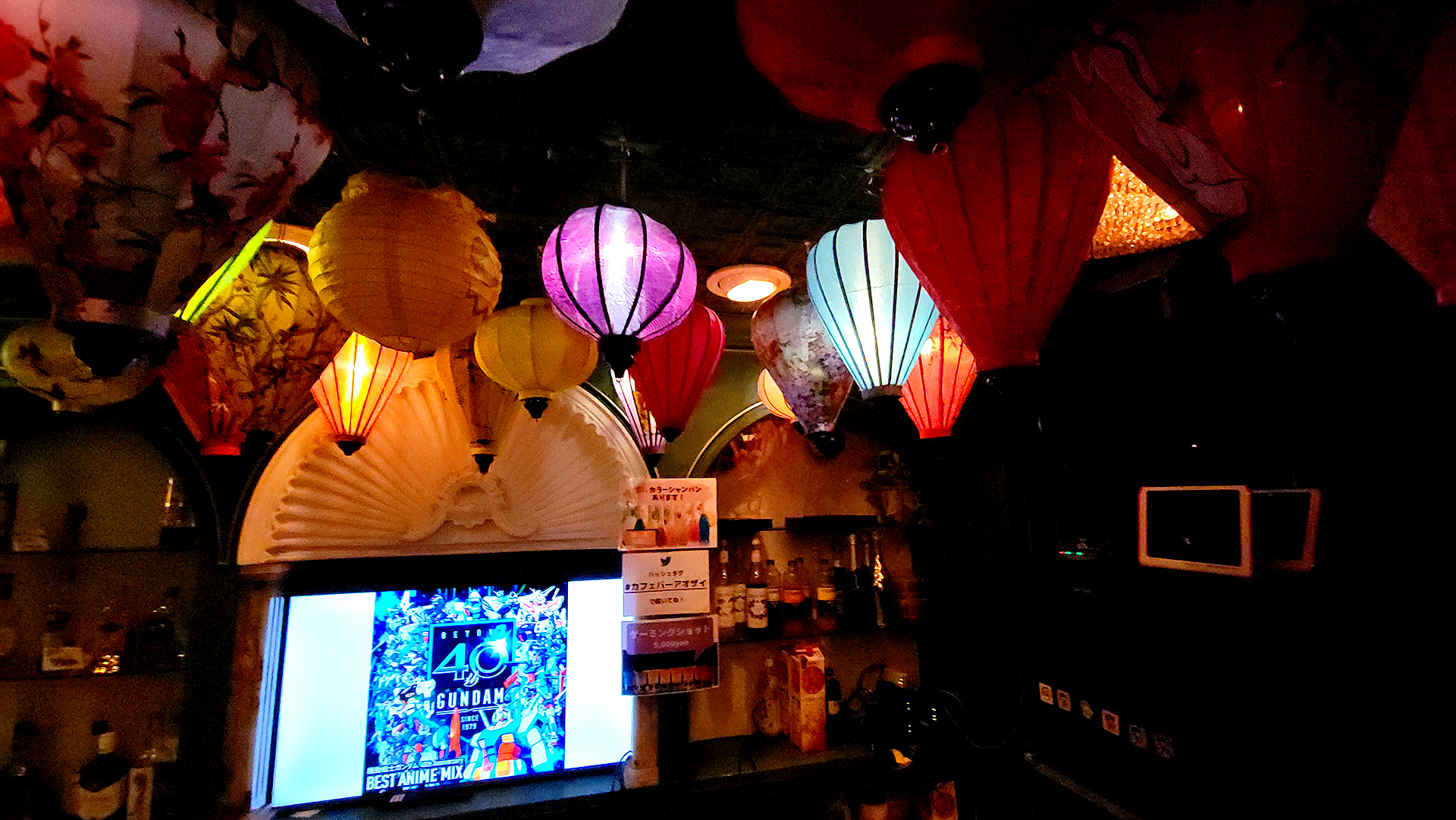 We soon arrive at the building Aodai was in and went up the elevator which opened up to a floor with multiple bars behind closed doors. Soon enough we found Aodai and walked in to find a dimly lit bar with various drinks lining the bar tabletop, lanterns decorating the ceiling, various game merchandise decorating the back wall, and autographed boards hanging along the walls.