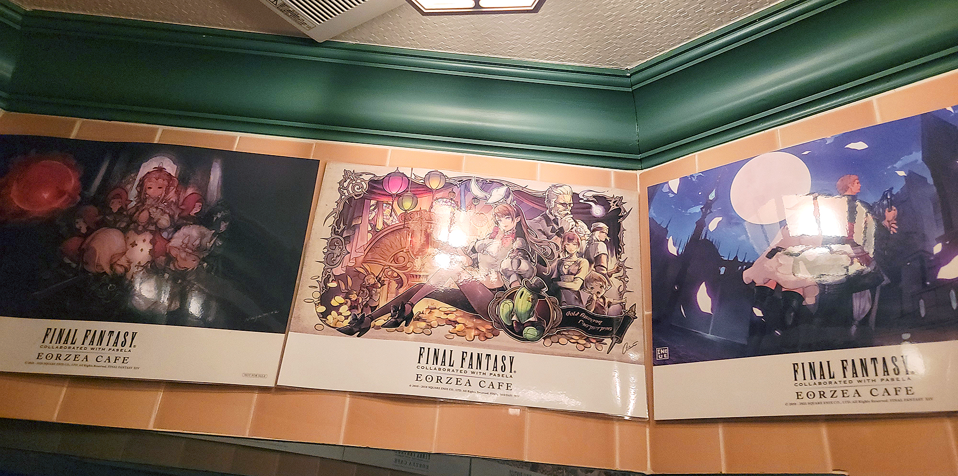 After having so many drinks in the past couple of hours you end up having to use the bathroom and the bathroom at Aodai was quite a sight to see with the EORZEA CAFE decorations featuring Final Fantasy artwork lining the top of the walls and the popular creature Carbuncle next to the sink.