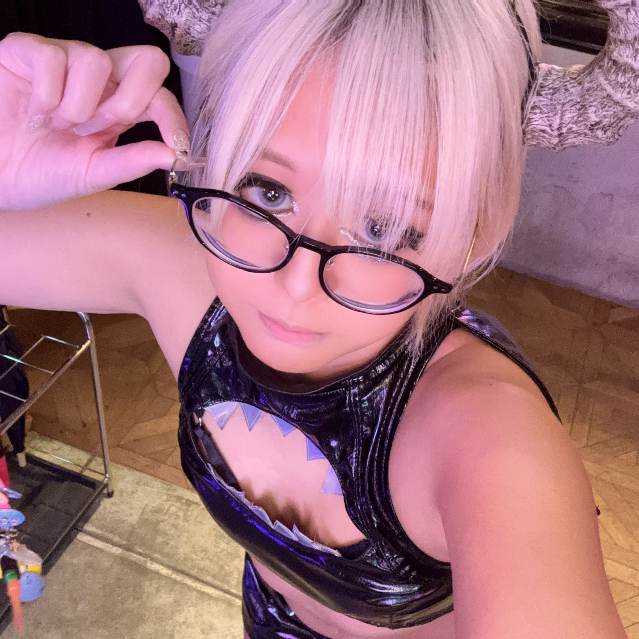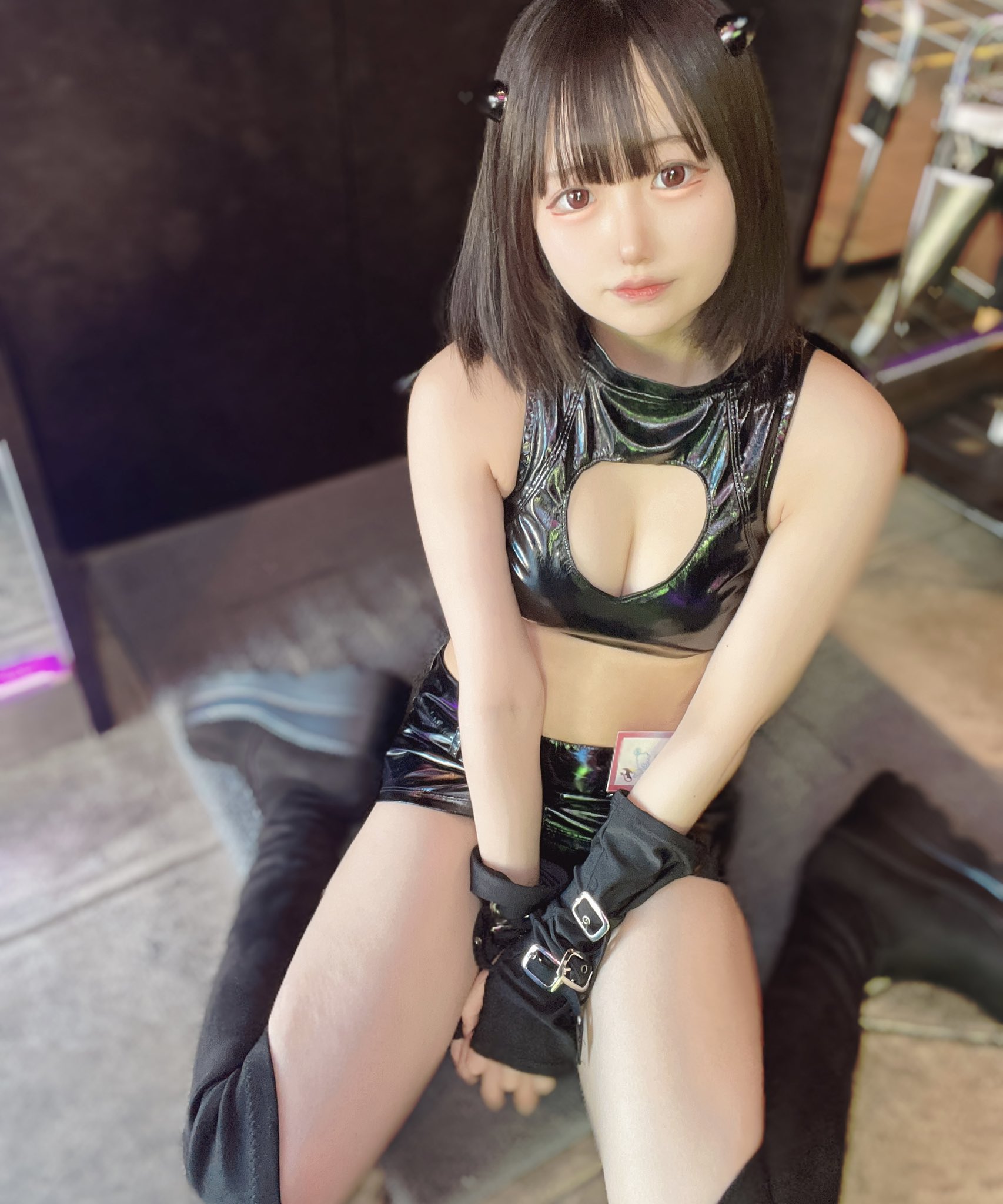 As we both came early June asked if I wanted to start the 2 hour tour early and I said yes! We went up to the 10th floor of the building which opened directly to ABYSS. This would also be June's first time going to Abyss. I asked June as a favor to me to pretend I don't know any Japanese as I wanted to see how June would interact with those around us like if I was someone on the Lovejoy Tour who didn't know Japanese. One of the "succubus" employees approached us and asked us if it was our first time in Japanese but noticed her calling us "honey" and "darling" in English; being called "honey" and "darling" would be repeated throughout the night by the various succubus employees. She was a cute and sexy tanned gyaru succubus wearing glasses who would be our main succubus for the night named Yuzuha. She wore a tight and shiny PU leather outfit which showed off her thin curves.