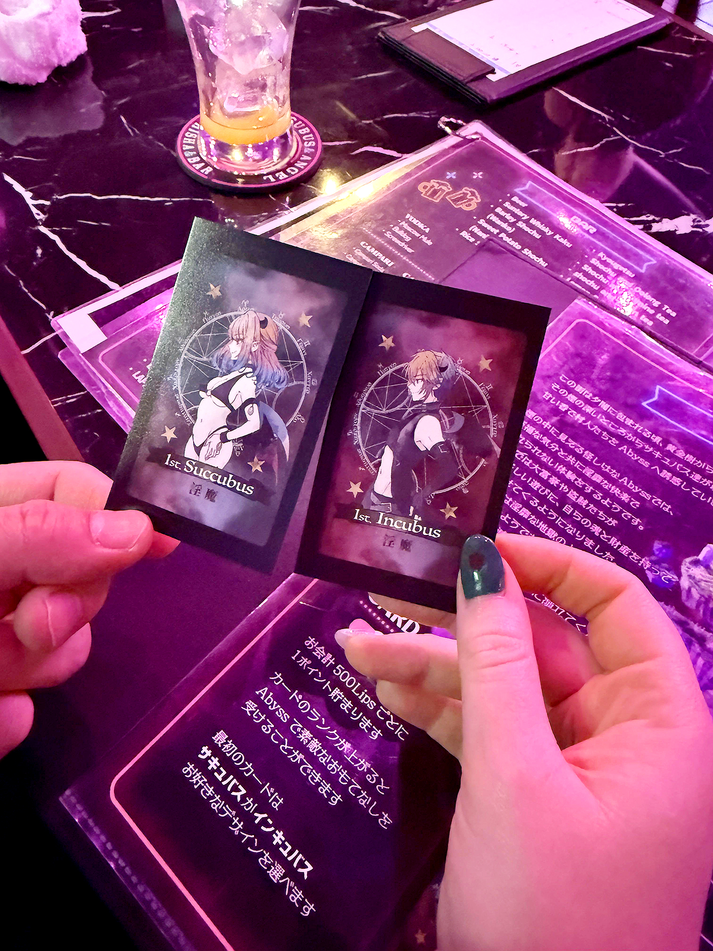 Yuzuha asked if we wanted a succubus or incubus card. The reason being they're point cards for Abyss and other succubus locations in Japan. According to the story each time you visit the cards get stronger and stronger so you can "evolve" the cards and get new cards with "stronger/sexier looking artwork" when they reach certain point levels which is cooler than your standard point card. At the same time she took our drink order.