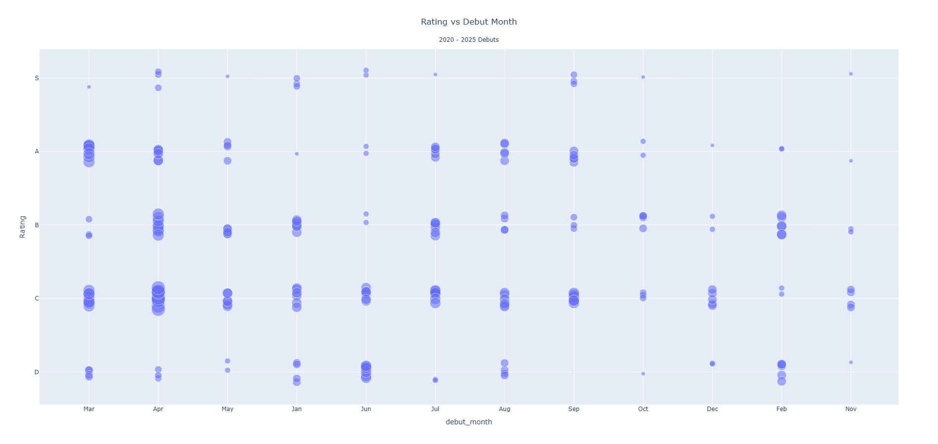 Woah, a graph? Yeah, sue me. But one thing I got interested in was to see if there's any value in watching earlier debuts, among a few other things for analysis. One of the strongest hypothesis I would have had was that the earlier the debut the more likely they are to get an S ranking. I would expect that because longer in the industry, more time to produce a good video and get some experience, seems straightforward. Turns out it's only a very weak correlation, both in 2025 and in general of all the years I've been doing this on ZENRA. The only thing that seemed to have a strong correlations that later months tend to have more middle of the road ratings. I can make sense of that by virtue of them being new, not really having a good grasp on potential, and giving them the benefit of the doubt in some places.