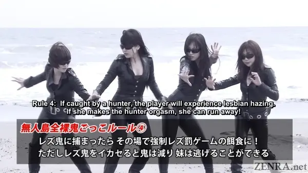 I really am blown away by how well this ROCKET release ended up being. It even has CGI! Good quality CGI too! You get your high-tech island map ala Battle Royale complete with various challenges that all predictably end with sexual and penalty games (hey, it's a JAV so sex is a given!). You can kind of consider STARK NAKED TAG an spin-off of the PRIVATE PARTS GUESSING GAME series. They're shot by the same director for the same company though RIRI KOUDA is swapped for a very brusque female leader who does her job very well. Said leader commands a small army of 'lesbian hunters' (that almost certainly features REMI MIURA and AYAKA KANOU). Seeing one of them strip stark naked for that 'kissing among the waves scene' was one of the highlights of this title.