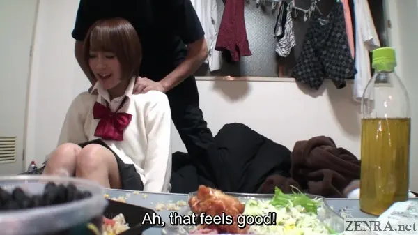 LATE NIGHT NANPA SUCCESS STORY stars AIKA SAEKI. We see her dressed in a high school uniform outside of a restaurant at night. She's idly playing around on her phone before Mr. Charisma*--the loquacious scruffy co-star of the Pubic Hair Shaving Salon enters the picture.