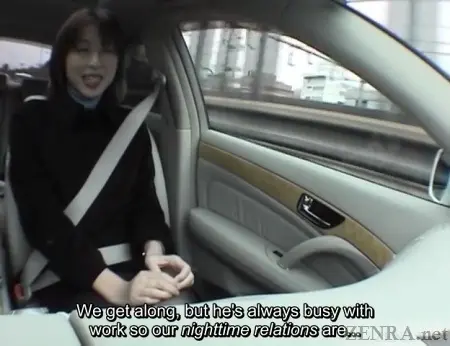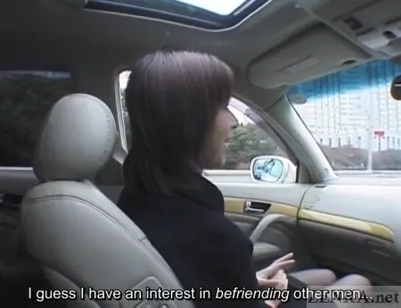 We hear more about her life of ennui being married to a decent husband who unfortunately has placed his livelihood over the well-being of his own wife. She wants adventure and excitement. In this late model Lexus with plush cream-colored leather seats, she receives both in droves first by masturbation--both given and self-provided--before she strips nearly naked at the risk of being spotted by other drivers.