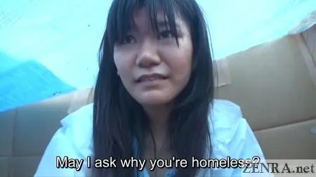 This title is done as a documentary with elements of a dark and dry comedy. At the time of shooting was YUUKO really homeless? Probably not, but like many adult videos that push realism, there's a good chance there were portions of the story she gave that actually were factual. Not everyone comes from healthy homes and it's more than possible she was one of the sad few who decided to run away from a troubled domestic situation.