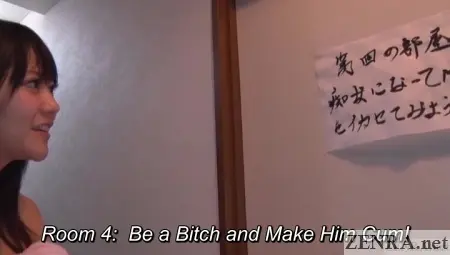 One of the things really nice about this series is how the actress remains naked almost from the get-go. For fans of pure nudity, this is a goldmine! It's visually awesome to see an embarrassed freshly-sexed Japanese woman being escorted down hallways by clothed support staff. It's even better when you can still see sweat and other 'bodily fluids' still clinging to her as she reads the next bizarre sexual 'mission' in her quest to 'clear' all the rooms.