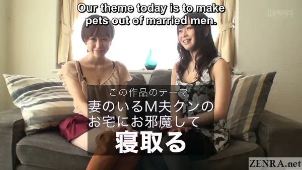 Rather than being a release about a wife who cheats (as we've shown plenty of those!), MAKING PETS OUT OF HUSBANDS takes their spouses and sees how far they'll go with two very sultry actresses. Confession: only the second half of the first scene really features a bona fide 'risky' encounter though the lack of present wives in the other scenes is made up in just how far they go. Literally in the of his real apartment, Nozomi and Hazuki get him naked for a nearly never-ending blowjob and sumata experience WHILE his wife was one room over watching TV and doing some light cleaning. Props for pulling that off and I sure hope his beloved never finds out about why there's a suspicious stain on one of the floorboards by the front door.