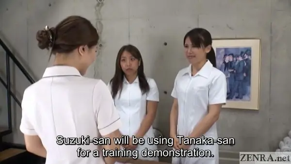 In AOYAMA 100, there are no clients. Instead, we're given three scenes of 'training'. Scene one features "Y.S." (those are her real stagename initials that we've been given the OK to write) providing treatment to a new hire. The objective is to show Suzuki-san, the new prospective therapist, a sample of what's normally provided at the AOYAMA CLINIC. The second scene features the head therapist guiding and helping Suzuki-san as she massages another coworker. I'm sure you can see where this is going as the third and final scene has both of them massaging Y.S. herself!
