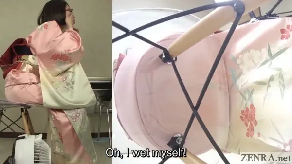 I ACCIDENTALLY PEED IN A KIMONO is a movie mainly for pee desperation fans. We do apologize for the lack of nudity; every scene did have it, but only at the end when each participant stripped out of her soiled attire and toweled off. Thus, like pretty much all previous titles by HAISETSU, this one's entirely non-sexual. We know as a site heavily featuring content for adults a title like this may be something of an oddball, but every so often fully maniac curve-balls are warranted.