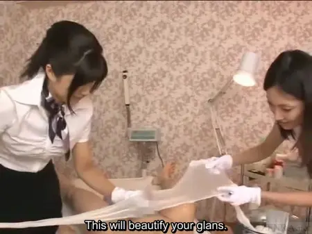 The group trend, a very common theme in these clips continues with a few segments on the new specialized penis health care clinics popping up all over the country. In fact, although clinic is the term used, spa is more appropriate due to the more sensual nature of the provided services such as the pantyhose pump stretch which as the name implies, one of the two cute female penis care specialists rubs pantyhose to and fro across your hardon while another gently 'stretches' your shaft by gently pumping it up and down.