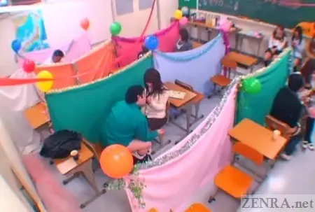 Dotted through the Masturbation Support Cafe are a gamut of unique above-angle shots showcasing the entire demesne of this quirky sexual schoolgirl club. It's definitely not designed for privacy as desks are positioned back-to-back with a thin curtain separating each row. Customers can see each other both during and after the acts hence the additional offerings of enhanced privacy as shown in the CFNM group-themed schoolgirl harem course.