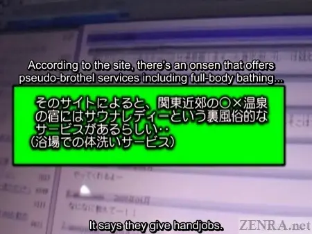 For such a well-reviewed bathhouse--or onsen as they are called in Japanese--finding it was a challenge. All this group of generally horny men knew was the area it was in. The reviewers were keeping its name hush-hush to avoid pressure from the authorities. After confirming with multiple hotels in town, they found a bathhouse that had Sauna Ladies on staff, but as shown in the first portion of the production, penis touching was on the menu, but it did not go all the way.