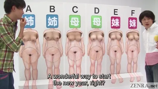 RIRI KOUDA works well as the host though the sheer insanity of the NEW YEARS EDITION almost made her an afterthought at times.  I'm not one to keep count of individual dialog, but I've a feeling that while her screen time may have been the norm, she didn't get as much to say.  I mean what can you say after you arrange six stark naked women in a pyramid that hasn't been said already in the previous mandatory creampie/pregnancy sex rounds?