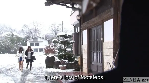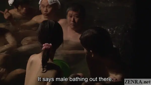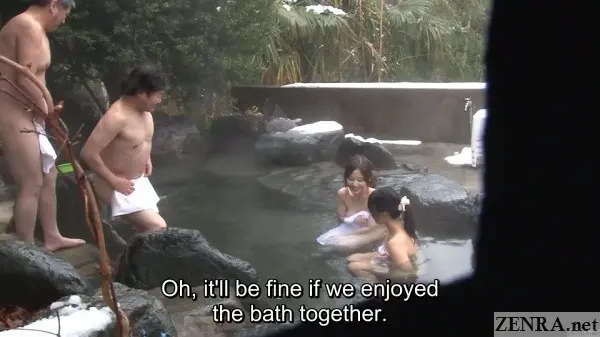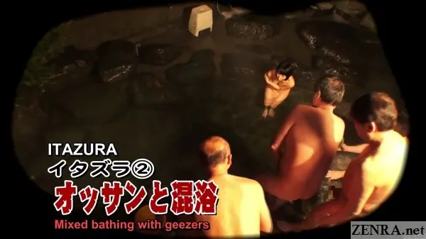 That's the format for each of the three scenes, by the way; a pair (scene one and three) and a solo traveler (scene two) book rooms at this real ryokan (yes, this was filmed on location and was NOT a set) and once they strip down to take a dip in their outdoor bath, MISCHIEF begins. Clothes are snatched, bathing area genders are switched, and suddenly they find themselves bathing among loquacious and quite healthy geezers without a way to cover up. Being a full-fledged JAV, embarrassed nudity soon leads to them fleeing back to the main building for even more odd-ball encounters that eventually lead to brazen group sex right out in the open.