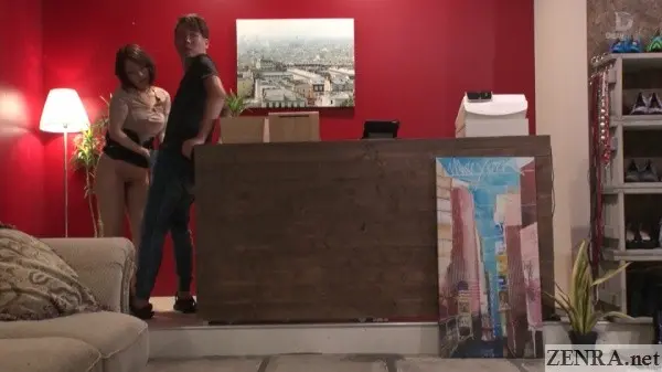 TEMPTATION CLOTHING SHOP with TSUBASA HACHINO sees an even larger cast including an additional female coworker. Adding women is the key point to make this realistic. Your guess is as good as mine whether we're seeing full-fledged JAV stars with their faces blocked helping out in a shoot, paid nameless extras, or actual crew members (like a makeup artist) doing double duty. Regardless, it helps make one believe this really is a clothing shop and those really are customers. Now unlike both DENTIST and SALON, CLOTHING SHOP is obviously a set. Keep that in mind because filming in an actual clothing shop presents some unique challenges compared to 'closed' offices like clothing shops and dental clinics. DREAM TICKET did a great job though in taking the huge WAAP studio and making one of its rooms a believable clothing store. The prep time for a JAV movie like this must have been intense. I also wonder where they got all that clothing from...