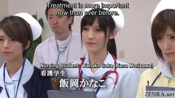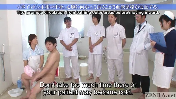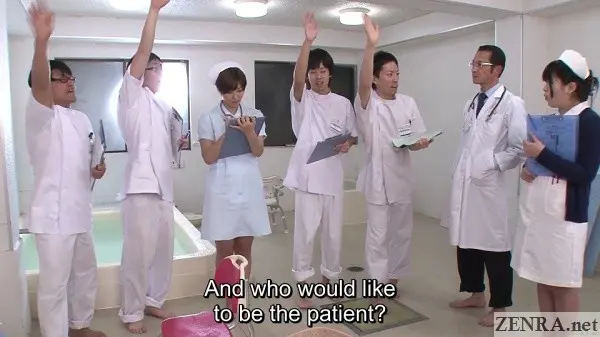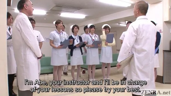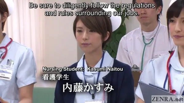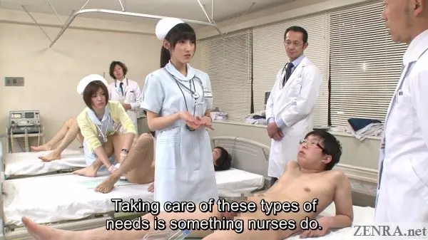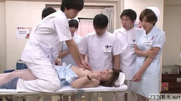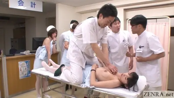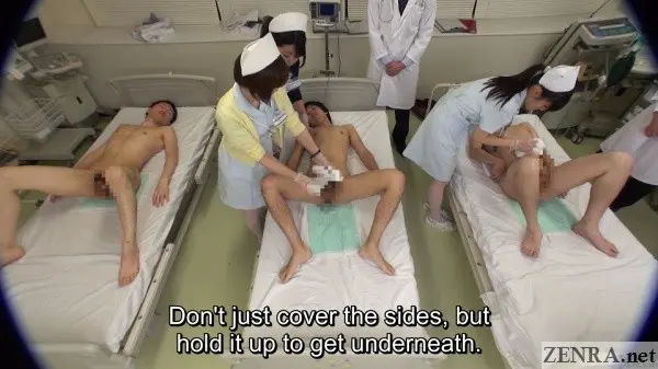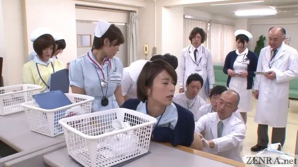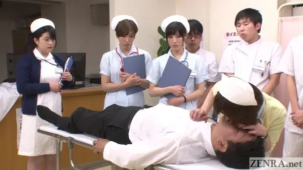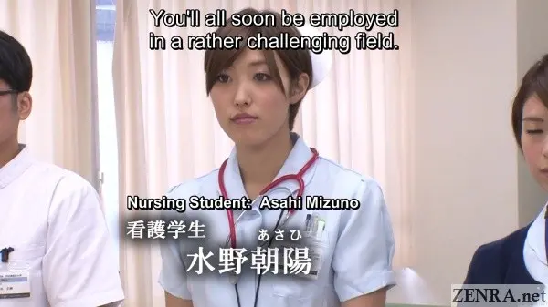 It's true that hands-on practical skill training is requirement for any prospective nurse, but going as far as to shave the pubic hair of your fellow students while everyone watches probably doesn't happen in real life.  Seeing your cute coworker spread eagle while you and your classmates take notes as the doctor spreads her vagina with a speculum also probably doesn't happen.  Assisted bathing including 'arousal disposal' via hands and mouths also is straight from JAV fantasy land.  And that all goes triple when it's ASAHI MIZUNO being the embarrassed and naked nurse on full display.