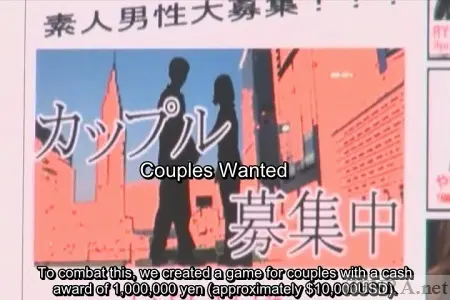 1000 Pump Nakadashi Challenge Marriage is quite the endeavour here, there--or anywhere really. The immense amount of commitment two people must adhere to is nerve-wracking and the responsibilities and loss of independence that comes with it may be too much to bare for the weakest amongst us. Of course, marriage is simply a huge step up life's stairway, though for the youth (and post-youth) of Japan, that step is one that they so dreadfully fear to tread. The reasons why matrimony amongst the willing and able in Japan is on the decline can take a book to spell out--it's that detailed of an issue. There are so many things bringing the youth down and scaring them off from righteous commitment. However, for the sake of the country, things must be done to alter the status quo. One such unique game of skill and fun--of the sexual kind--takes center stage today. From the first smatterings of on-street interviews of presumed Japanese couples to a quick rundown of the burgeoning marriage issue, the building blocks of this strange yet unique game come together. 'Coupled Wanted!' reads a large banner on the homepage of a famous studio. Although the initial advertisement makes no mention that non-hitched couples are preferred, due to Japan's woefully low numbers of married folk, only unattached couples make the final cut for this strange game of endurance and chance. The game itself is quite simple: have sex without a condom using at least three positions and finish exactly at the 1000th thrust via ejaculating on your partner's face. It's not immensely challenging by any means and couples are pining for the chance at it as the for success comes in at a staggering one million yen (approximately $10,000USD). When your average twenty-something Japanese salaryman only making a fraction of that a month, having an extra million yen in the bank is desirable. Calling this avarice would be a travesty.