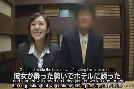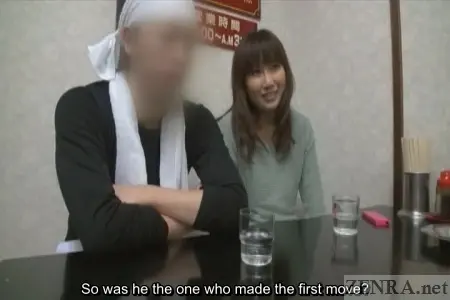 Each of the four scenes begins with an on-location interview. Outside of the nearly pure white studio, we see glimpses of 'real Japan' via the aforementioned ramen shop, an izakaya (Japanese style whatever-ya-got restaurant), a coffee shop, and a less than desirable housing unit. Here, the couples are initially introduced and are asked about their stories. Conversation centering around their dating history together, how did they meet, etc., is carried out before finally talking about their desires for taking part in the 'challenge'. At the end, dates are confirmed and a studio map along with a nice 10,000 yen x 2 participation bonus is handed out. The studio itself is bare-bones and empty, yet due to the warmth that the one-and-only Myuu-san brings (yes, the same Myuu-san who has hosted a plethora of CFNM films on Zenra), an aura of coziness is present. A second round of interviews takes place with the timid couples. Timid, due to fact that they'll be nude and engaging in the most carnal of acts in a short moment while being filmed. These second interview rounds focus more on the naughty parts of their relationships rather than the more mundane details covered earlier. Here, Myuu-san with her ribald sense of humor, sneaks in lewd questions about fetishes and memorable sex acts and surprisingly digs out answers. One of the biggest upsets came from the third couple--the one with the huge age gap. That timid accounting employee wholeheartedly enjoys having her anus licked! Fortunately, her partner gives and gives and even receives some in the double rimjob they engage in as they 'warm' themselves up for the main event. Most couples have mentioned that they've always engaged in safe sex--intercourse using a condom. However, the objective of today's event is to see how long they can go without a condom. Can they make it to 1000 thrusts? What if they finish too early (hint, this happens more than once) or too late (this also happens...but...)? The rules of the contest when it comes to timing are anything but forgiving, but Myuu-san, being the unsullied angel she truly is, offers couples who finish too early a deal: they can go for another round right away and if a second ejaculation is achieved precisely on the 1000th thrust, they will receive half the . This second go-around is quite the tall order. In fact, one couple came within 140 thrusts of the goal before accidentally finishing. Going from freshly ejaculated to rock hard and ready to finish once again in 140 thrusts is nigh on impossible--even for the most sprightly amongst us yet one couple tries their darn hardest. The reactions to the couples who had an early orgasm are hilarious: the female boss tersely instructs her younger co-worker to get to it whereas the college couple's beau also plunges right back in mixing his rebounded stiffness with fresh semen and the womanly juices of his lover. Doing the act bareback for the first time in combination with that unique milky sensation surely feels soundly piquant.
