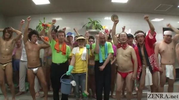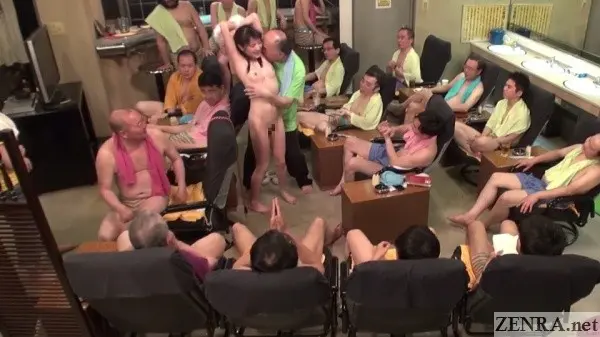 Common in pretty much all scenes, we see JAV stars first find themselves suddenly the only women in a male onsen followed by a panicky flight to the changing room to find their clothes missing. Some then try to migrate to safety only to be caught in the lobby or the big leisure room. Others never make it out of the onsen itself. Sex for all is a given. Some end in creampies, others in facials. Some have a festive atmosphere with big crowds of patrons and staff cheering them on. Some end slightly weirder like that great naked massage with audience scene halfway through.
