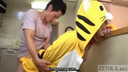 This is about the time scenes go from playful fun to erotic romance. Most scenes consist of the man of the house sauntering back into the bathroom--or the kitchen in one scene--and commencing anything but traditional romance. Seeing a Japanese woman clad head to toe (with an exposed butt of course) while being taken from behind by a more mundanely dressed man is one of those things that'd only work in Japan. The west has nothing on this.